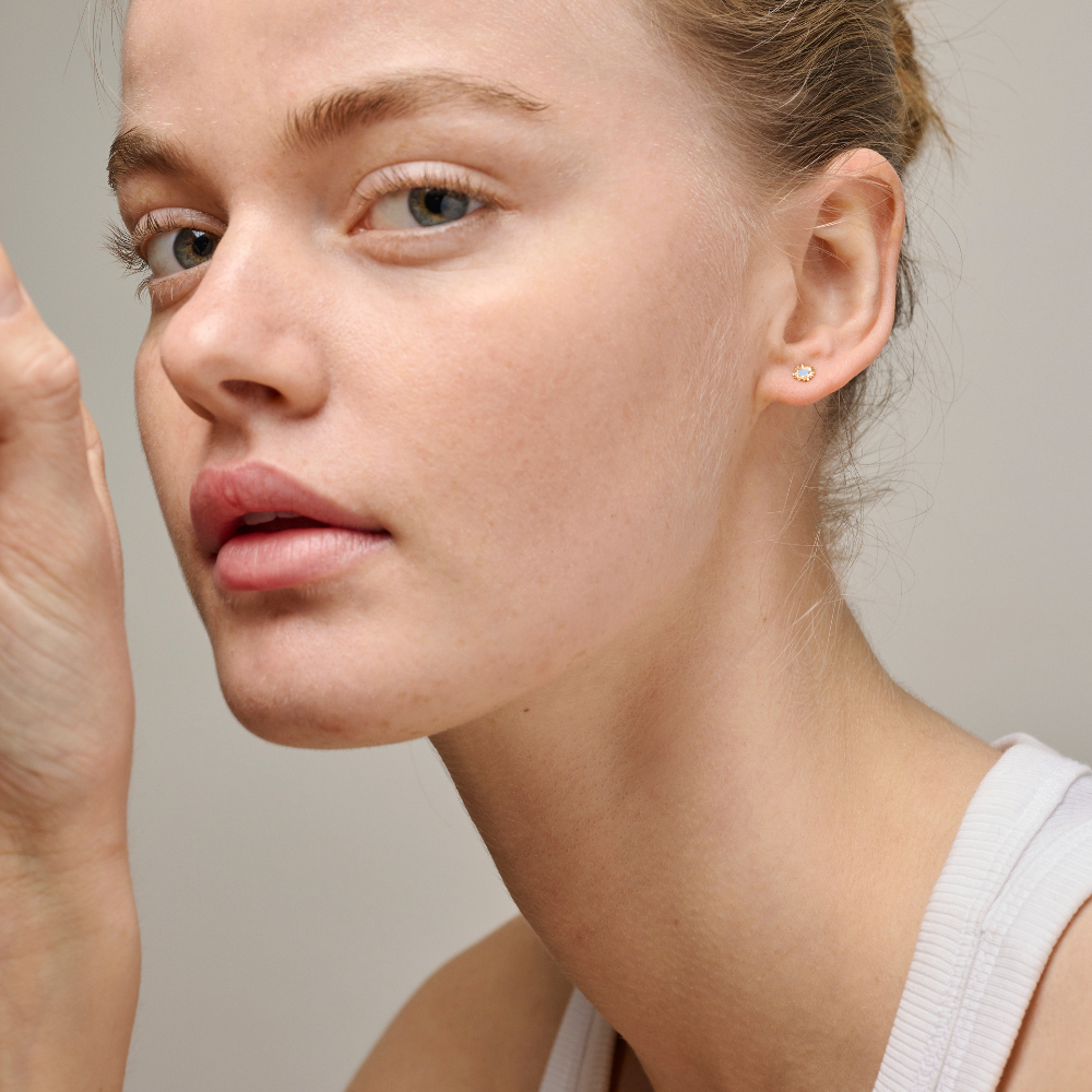For at bevare både forgyldning og emalje bør smykket undgå kontakt med vand, parfume og kemikalier. Opbevar ørestikken tørt og separat, og rengør den forsigtigt med en blød klud.