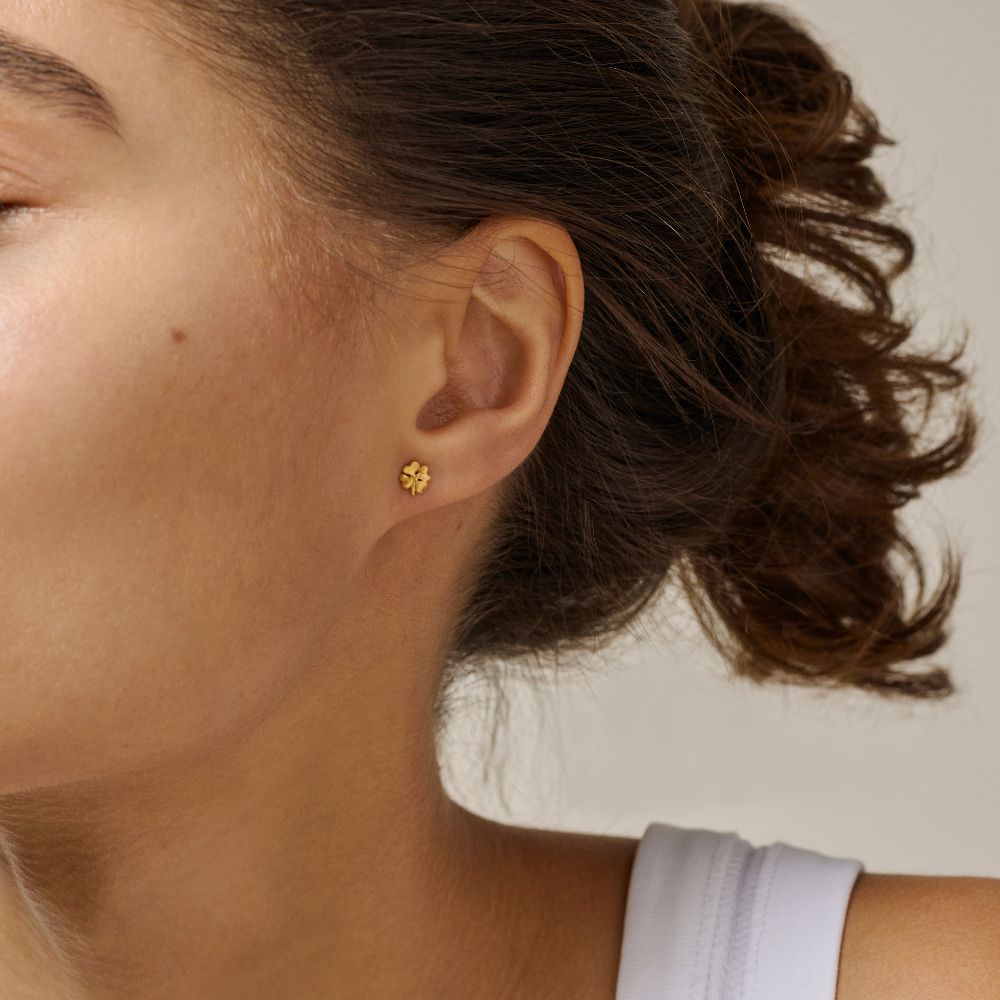 Organic Clover Mini Stud fra Enamel Copenhagen i forgyldt sølv er en feminin og varmfortolket ørestik med et organisk firkløverdesign. Firkløveren måler ca. 5,5 mm og er udført med bløde, naturlige former, som giver et levende og moderne udtryk.
