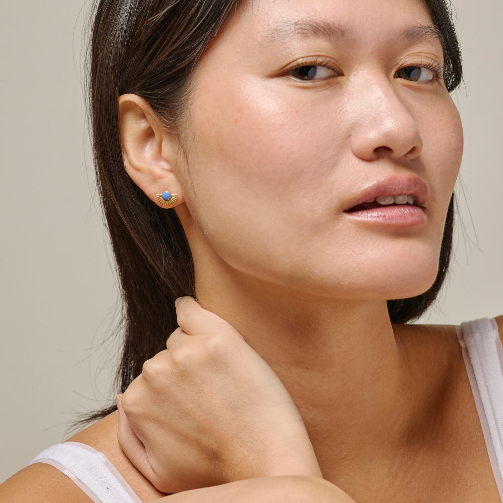 Soleil ørestikker fra Enamel Copenhagen i forgyldt sølv er et fint og karakterfuldt smykke med et solinspireret design. Ørestikken er formet som en halv sol, hvor de bløde, strålende linjer giver et organisk og let udtryk.