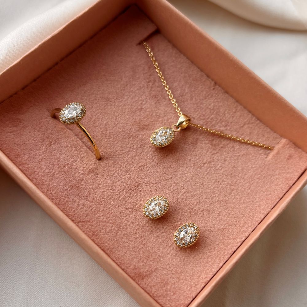 Design: Oval rosette med central sten omgivet af mindre zirkonia-sten