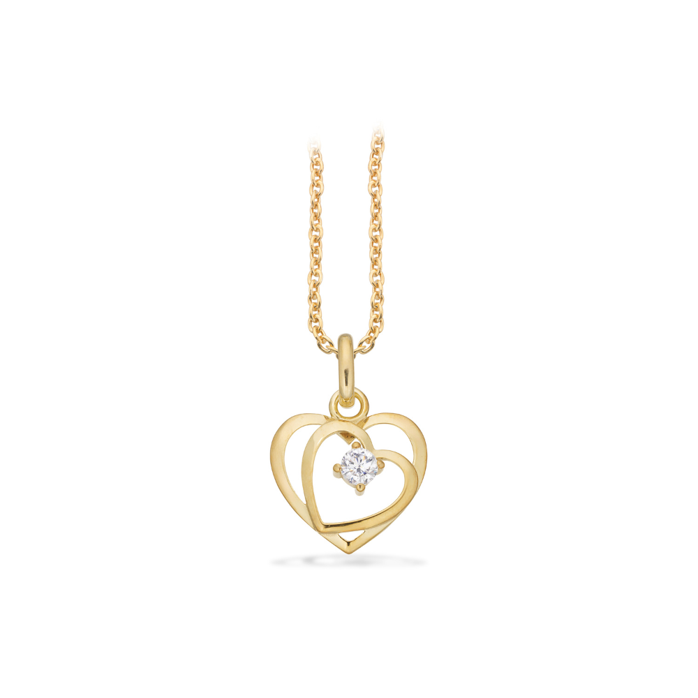 Romantisk og tidløs forgyldt halskæde fra Scrouples med et smukt dobbelt hjertevedhæng i 8 karat guld. Vedhænget er formet som to hjerter, der smelter sammen, og i midten sidder en funklende zirkonia, som giver smykket et elegant og kærligt udtryk.