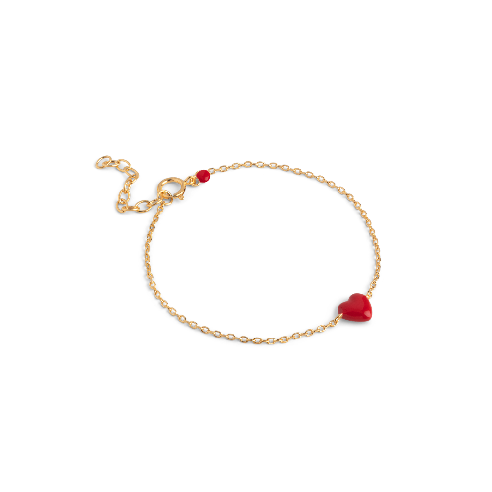 Det røde hjerte fungerer som et diskret, men iøjnefaldende statement, der gør armbåndet ideelt til både hverdag og særlige anledninger. Emaljens glatte overflade giver en flot farvedybde, mens den gyldne kæde skaber en varm og moderne kontrast.