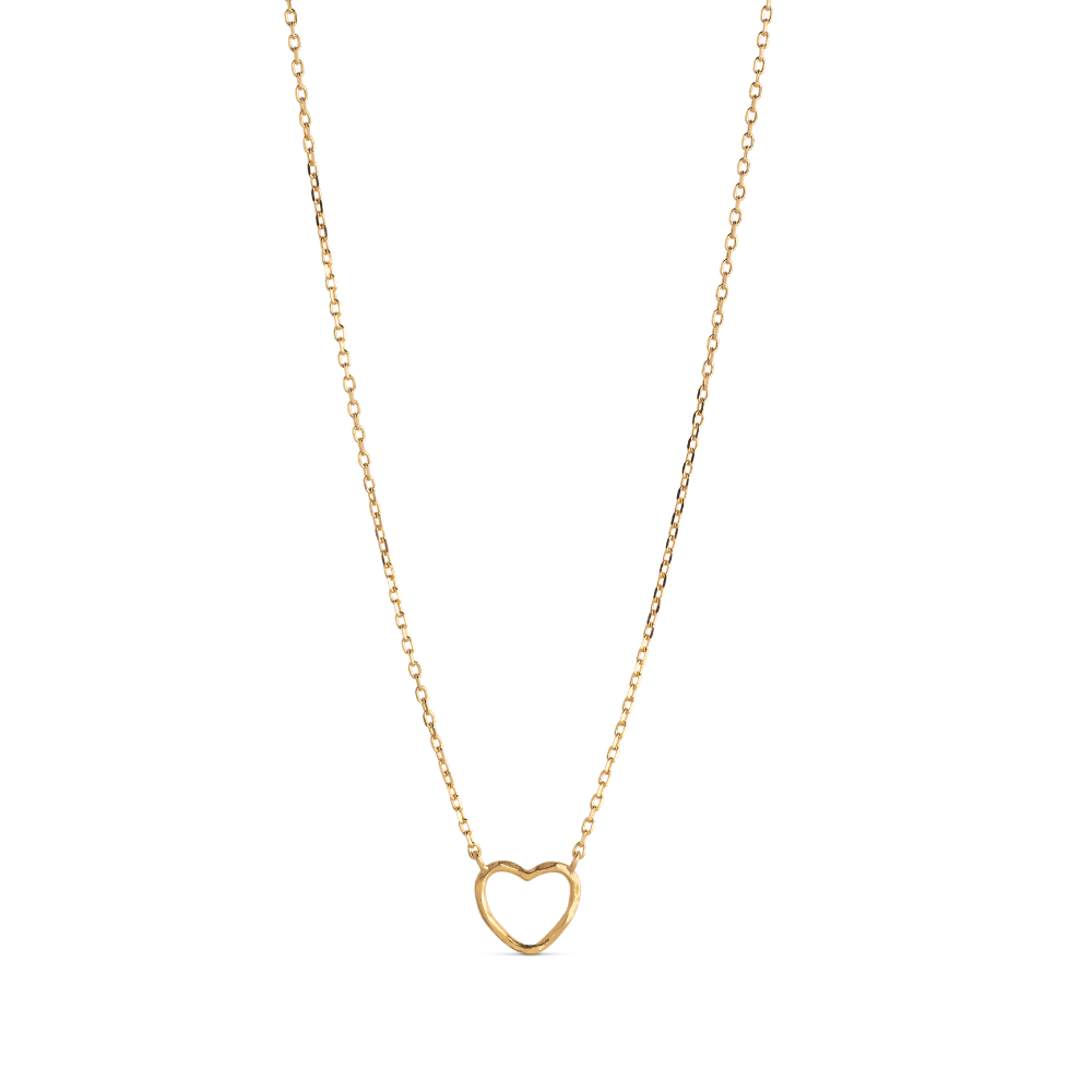 Det åbne hjerte på ca. 11x12 mm har en let og asymmetrisk form, som giver halskæden et levende og personligt udtryk. I stedet for et traditionelt vedhæng er hjertet integreret i kæden, hvilket giver et rent og sammenhængende look.