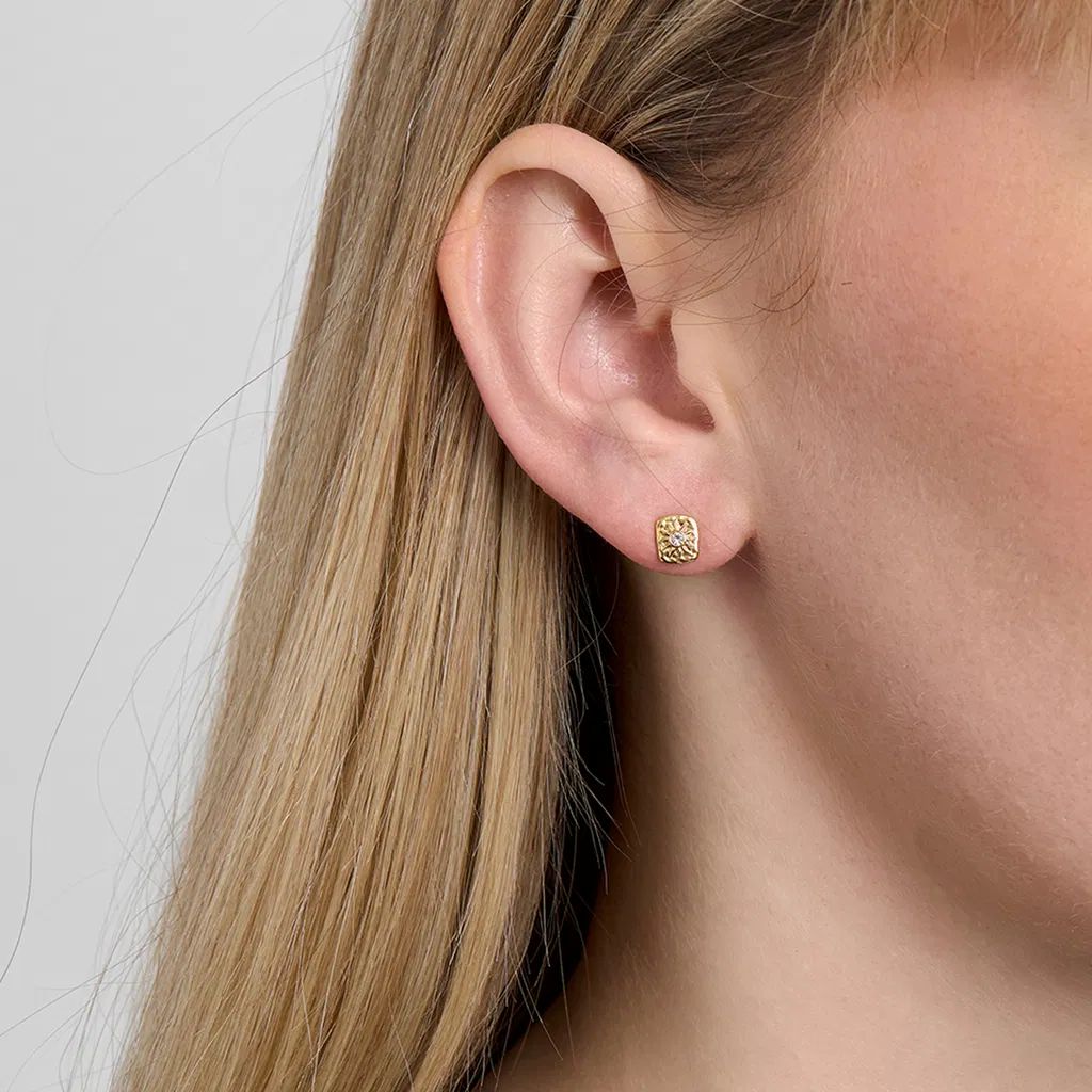 Solara ørestikkerne fra Studio Z er et elegant og tidløst smykke med et råt twist. Øreringene er fremstillet i 925 sterlingsølv og belagt med 18 karat guld, hvilket giver en varm og eksklusiv finish. Den dekorative plade har en hamret overflade, som skaber et levende spil i metallet og understreger det organiske design.