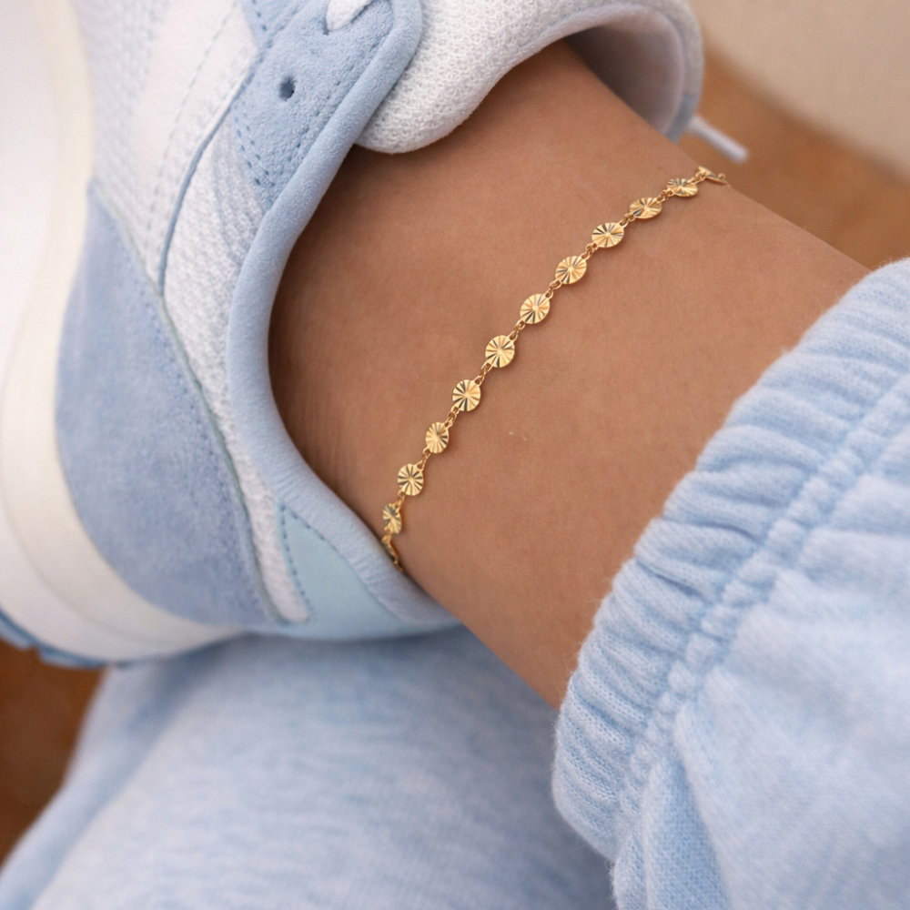 Elegant og feminint ankelkæde i forgyldt 925 sterling sølv med smukke plisserede poletter, der skaber et levende og glitrende udtryk. De små poletter har en fin plissé-overflade, som fanger lyset og giver smykket et elegant spil ved bevægelse.