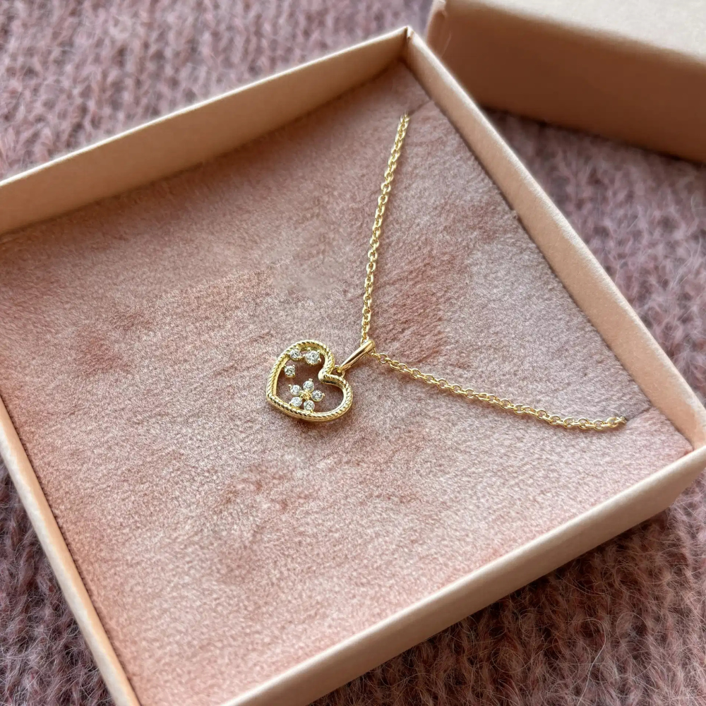 Vedhænget måler 11x10 mm og leveres med en forgyldt sølvkæde på 42+3 cm, så længden kan justeres efter ønske. Kombinationen af det ægte guld og de skinnende zirkonia-sten gør dette smykke til et elegant valg – perfekt som kærlighedsgave eller Valentines gave.