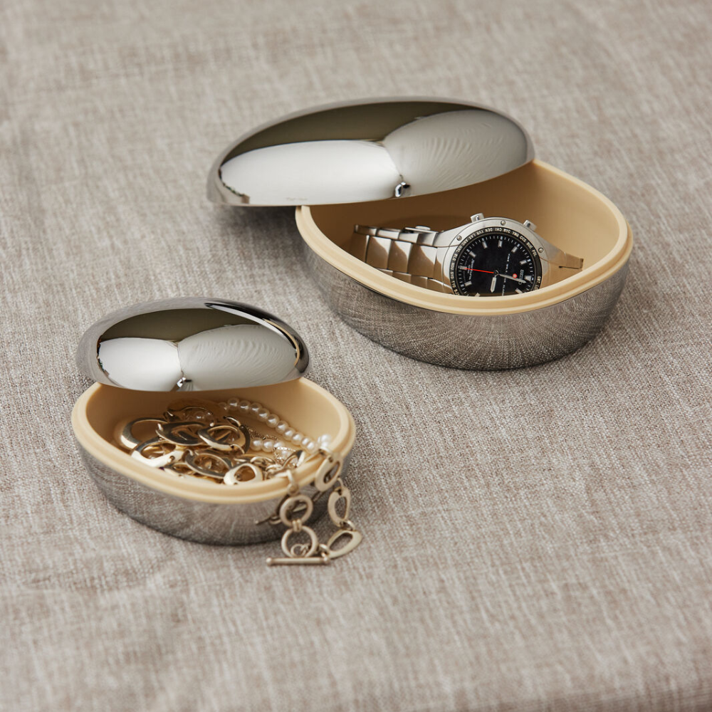 Smykkeskrinet er designet i den ikoniske superellipse-form, som er kendetegnende for Piet Hein. Kombinationen af blankpoleret stål og sandfarvet indlæg giver både elegance og funktionalitet.