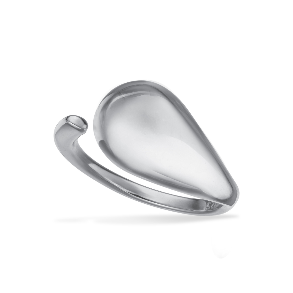 Ringen har en elegant dråbeform, der snor sig om fingeren, hvilket giver et flydende og harmonisk udtryk.