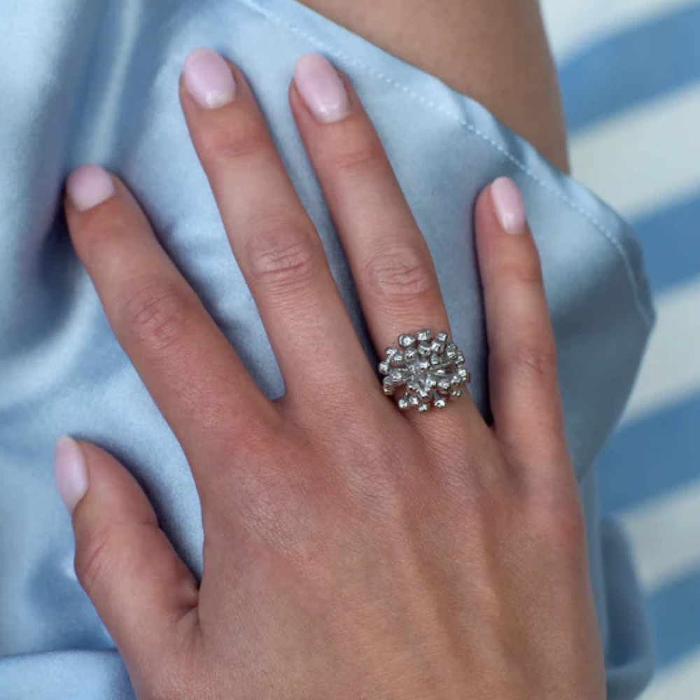 Oplev en tidløs fusion af elegance og naturinspiration med Flora Danicas ikoniske store Dild statement ring, skabt af en autentisk dildblomst plukket fra den danske natur tilbage i 1950'erne. Dette moderne mesterværk har i årtier begejstret mennesker landet over med sit unikke udtryk, der ikke blot er et smykke, men også en hyldest til naturens skønhed og historie.
