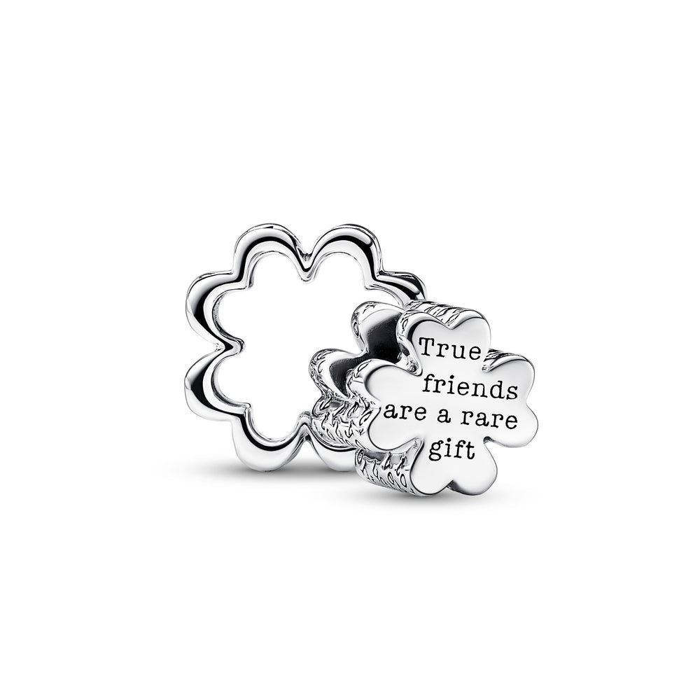 Del et sjældent og betydningsfuldt bånd med Pandora's Firkløver Charm, en unik gave, der kan skilles i to dele. Denne del repræsenterer mere end blot held; den symboliserer også en dyb og sjælden venskabsforbindelse. Charmen har en smuk kerne med grønne sten på den ene side og en rørende gravering på den anden: "True friends are a rare gift."