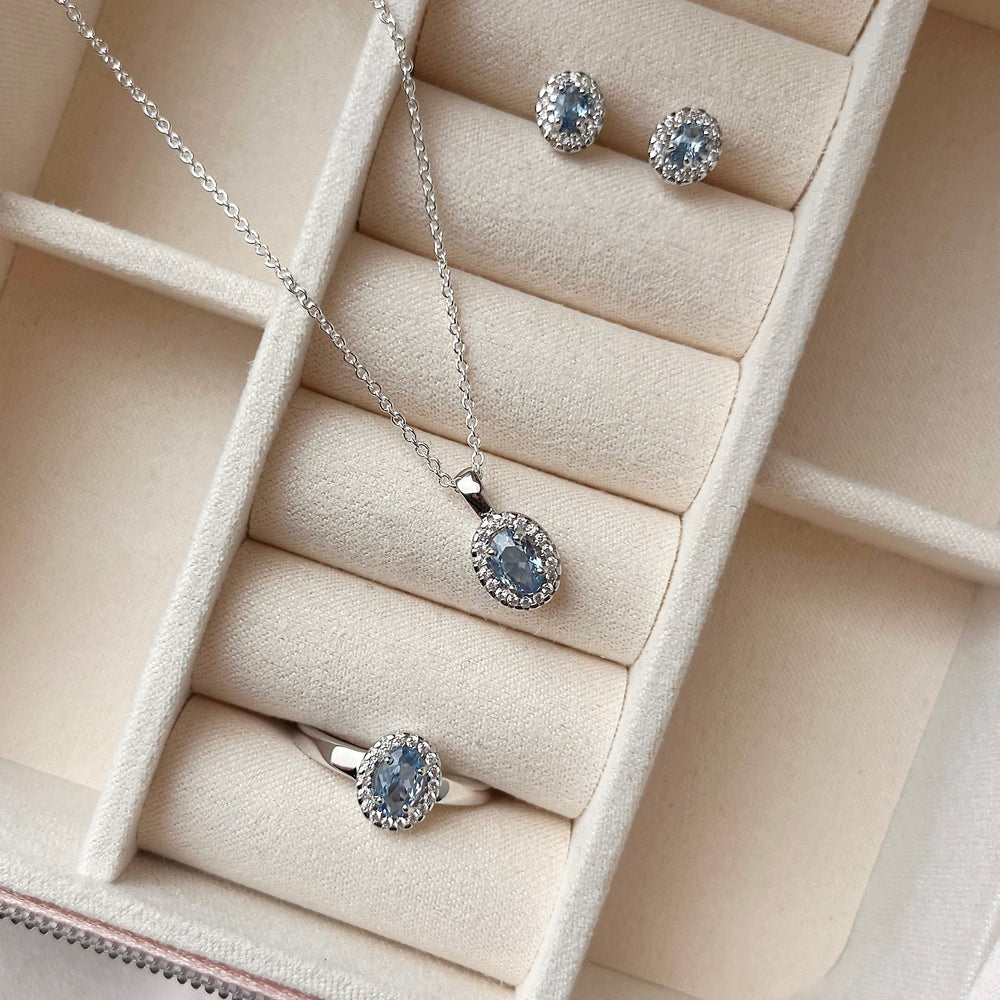 - Sten: Lyseblå midtersten, omkranset af hvide zirkonia