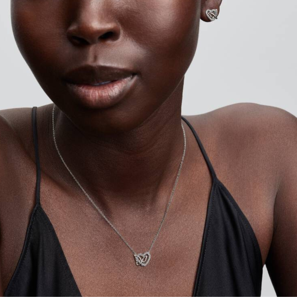 Oplev et smykke fyldt med symbolik og elegance fra Pandora. Denne smukke halskæde i sterlingsølv kombinerer et klassisk hjerte med en fin sommerfugl i et unikt, flettet design – et udtryk for kærlighed, frihed og forvandling.