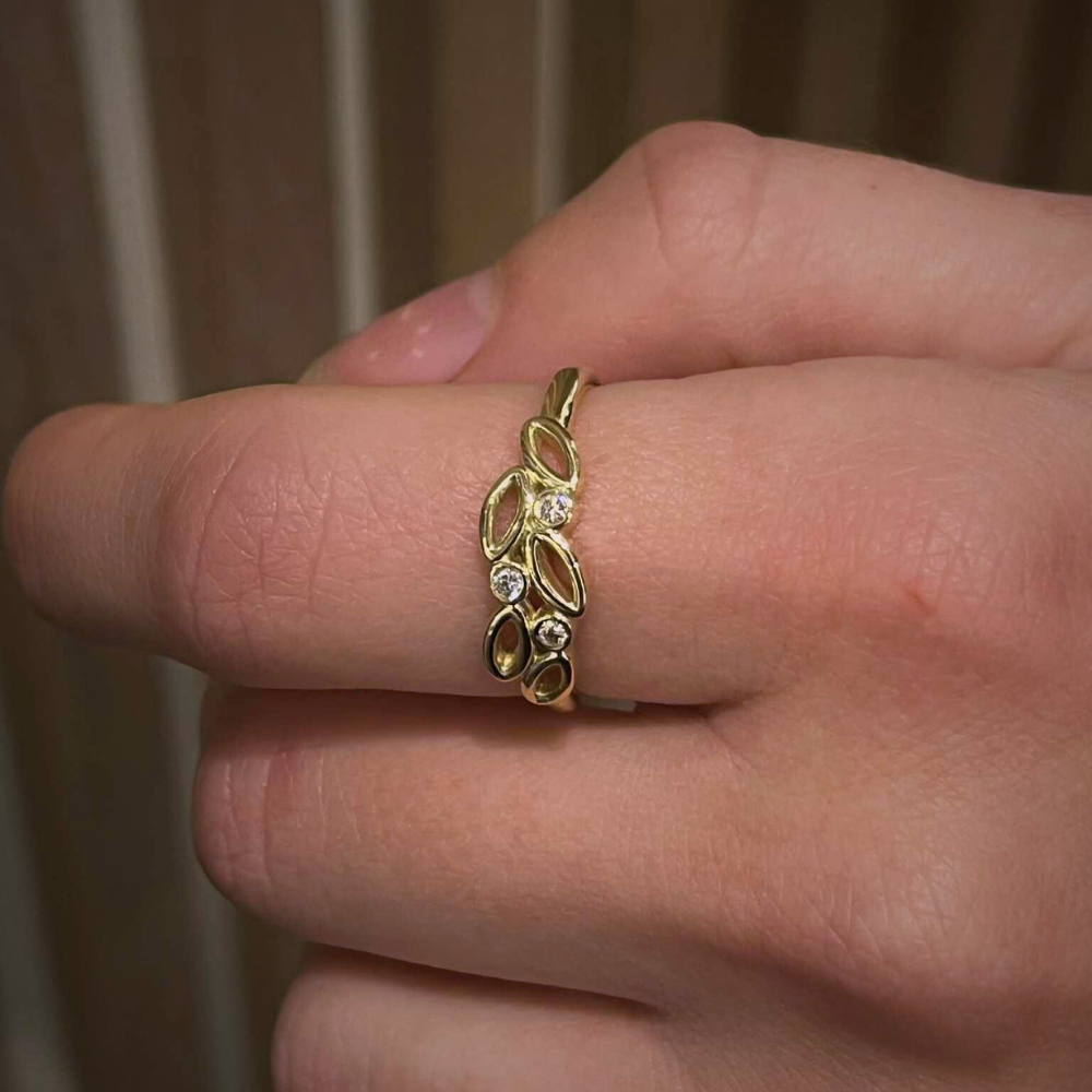 Oplev årets unikke smykkedesign med Årsringen 2026 fra Guldsmed Lind – en eksklusiv ring håndlavet i 14 karat guld og skabt med inspiration fra naturens smukke, organiske former. Ringen er udsmykket med 3 brillantslebne diamanter á 0,02 ct (WSI1), elegant indfattet i rørfatning, som giver et moderne og tidløst udtryk.
